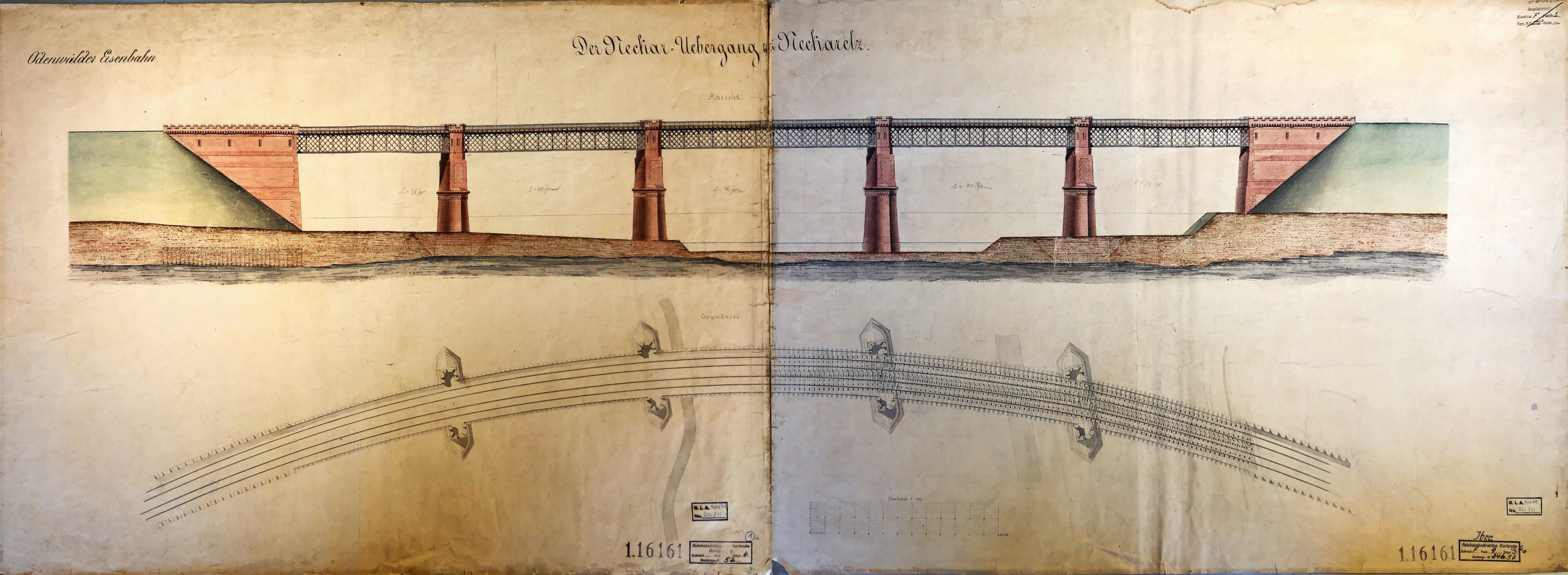 Die Neckarbrücke. Groß, majestätisch, seiner Zeit voraus, ein wahre Ingenieurskunst für die damalige Zeit. Die Pläne der Brücke sind soweit alle vorhanden, von dem Bahnwärterhaus fehlen die Pläne bisher noch. Da allein schon das erstellen der im bogen gebauten Brücke eine Herausforderung für sich ist, wird der Zusammenbau wohl auch nicht leichter sein. 5 Brückenelemente (drei verschiedene Längen), 2 Widerlager und 4 Pfeiler. Imposant und groß. Auf Obrigheimer Seite schließt sich gleich der Kalksberg mit Tunnel an, davor ein Bahnwärterhaus. Der Nachbau wird voraussichtlich aus 3-5 Modulen bestehen. Den Gleisplan von vmtl. um 1910 finden Sie hier.