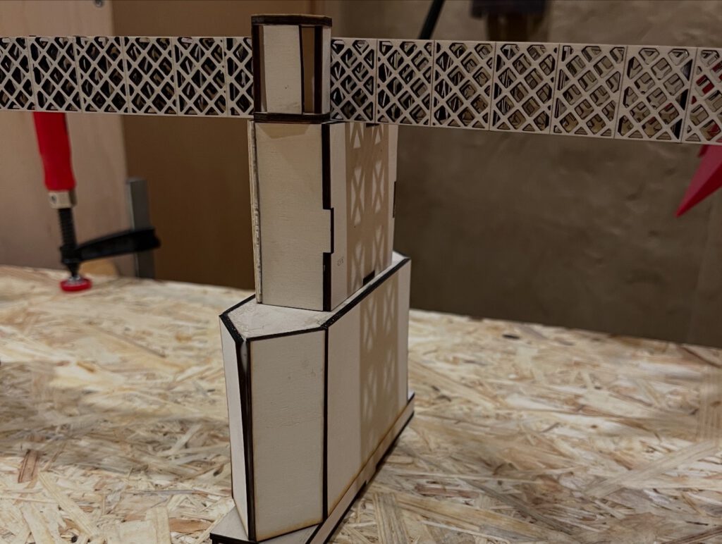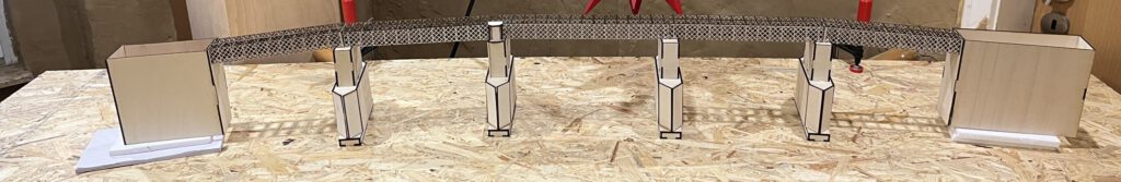 Nach langer Vorbereitung habe ich es endlich gewagt die ersten Brückenteile Lasern zulassen. Der erste Versuch ist grundlegend in die Hose gegangen. Habe ich dafür das falsche Material gewählt. Der zweite Versuch sollte mir aber gelingen. Sogar besser wie erhofft. Die Brücke wirkt echt riesig und lang. Im Rohbau ist sie jetzt fertig. Als nächster schritt werden die Außenseiten bearbeitet. Das heißt: den Lasercutter wieder anschmeißen und die Verkleidung rausschneiden lassen, damit Widerlager und Pfeiler im Sandstein Gewand gekleidet werden können. Nebenbei werden dann noch die „Türme“ der Pfeiler zusammen gesetzt und auf die Pfeiler geklebt.